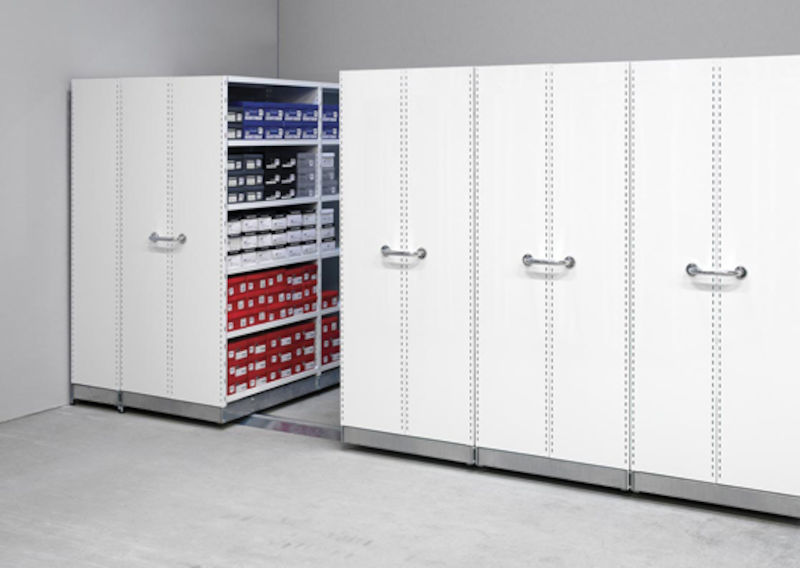 Våra rullarkiv rymmer ungefär dubbelt så mycket som ett vanligt hyllställ på samma yta, och är den rätta lösningen för dig som vill komprimera din förvaring på en och samma yta.