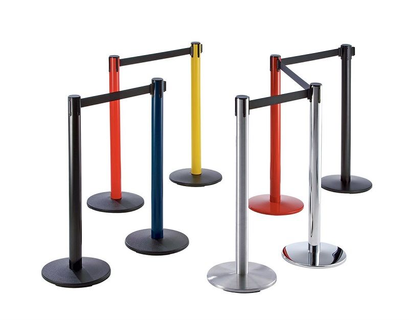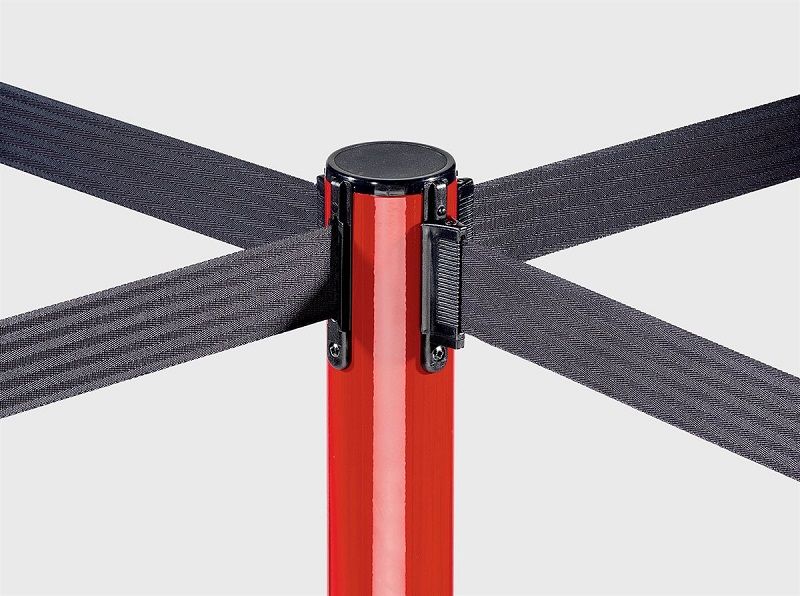 Avspärrningsband på stolpe, rostfri. Rikta dina besökare, avgränsa områden och stäng av utrymmen där du inte vill att obehöriga beträder. Avspärrningssystemet har en förstklassig kvalité och funktion. Alla system har ett patenterat bromssystem för avspärrningsbandet: banden dras in mjukt vilket minskar slitaget på banden och ökar livslängden på systemet. En spärr hindrar att bandet lossar av misstag. Fotens diameter är 345 mm. Stolparnas avspärrningsband kan kombineras med varandra och med väggkassetten för att byggas ut enligt behov. 4-vägssystem. Svart band. Tung gjuten fot, stolphöjd 968 mm, i rostfritt stål. Utdrag max. 2300 mm, rekommenderat 2000 mm för att bibehålla sin spänst.