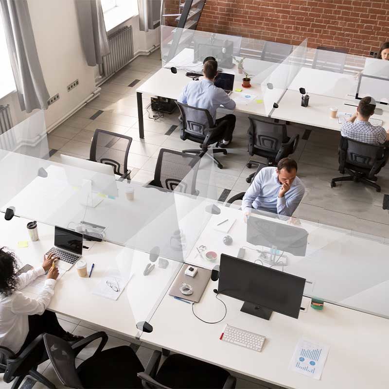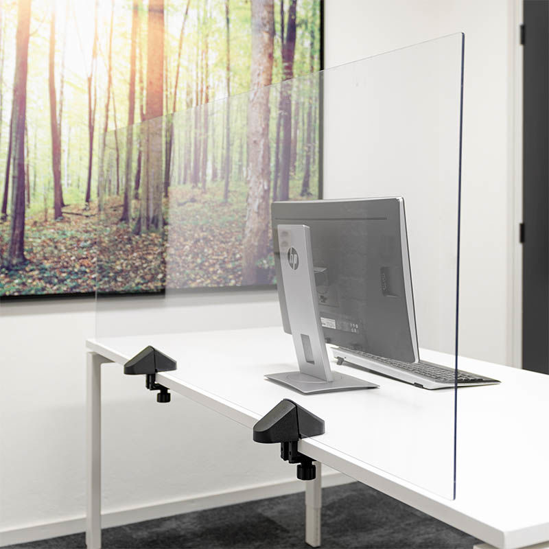 Bordsskärm Lodiken, plexi, HxB 590x1200 mm, dubbelsidig. Arbeta skyddat men ändå öppet och synligt med kollegorna. Enkel och snabb montering med två bordbeslag för skivtjocklek på 15-34 mm. Enkelsidigt beslag passar lika bra på höj och sänkbara skrivbord. Dubbelsidiga beslag passar för fasta bord. Perfekt för arbetsplatser med öppna landskap där skrivborden står mitt emot varandra. Lätt att rengöra och desinficera. Tillverkad av akrylglas och polystyren. Det finns 3 olika bredder som kan kombineras. Levereras komplett med två bordsbeslag.