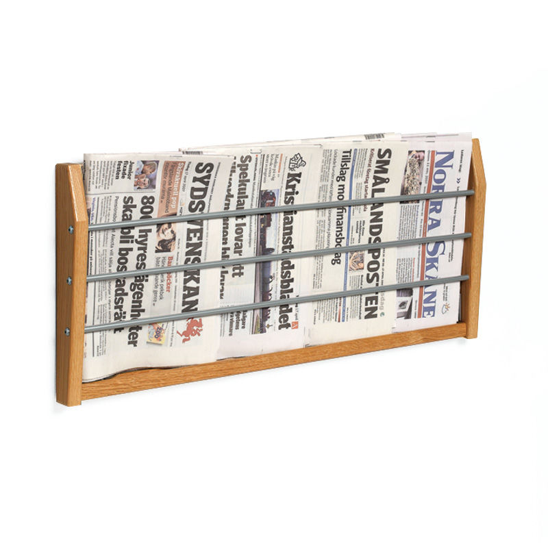 Tidningsställ Vägg, bok. Ett vägghängt ställ för förvaring av tidningar och större broschyrer. Tillverkad av en ram i massiv trä (bok, björk eller ek) och stålrör i silverlack. HxBxD 300x670x48 mm. Antal fack: 1st.