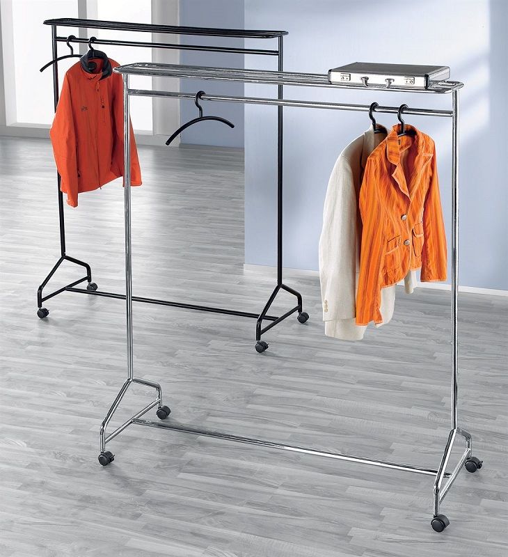 Klädställning med bromsade hjul, BxDxH 1490x560x1750 mm, svart. Gjord av stabila stålrör, med brett bygelrör och plats för många plagg. Fyra länkhjul med bromsar som standard. Finns i krom/svart eller svart utförande.