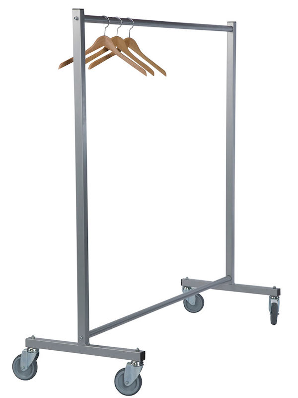 Klädställning på hjul Odelia, 1700x600x1690 mm, grå. Konfektionsställ med fyra länkhjul i mycket kraftig rörkonstruktion för tuff hantering. Praktiskt och tålig förvaring för kläder.