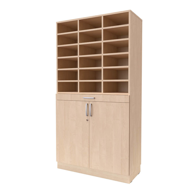 Postfack Jorun för golv, 18-fack, björk, utdrag. Med posthyllor får ni ordning och reda på er posthantering. Välj mellan antingen golv eller väggmodell i bred eller smal version. Finns i flera utförande efter behov, till exempel med praktisk utdragsskiva för avlastning vilket underlättar hanteringen av post när man behöver någonstans att ställa saker tillfälligt eller låsbart underskåp som exempel. Kommer i bok, björk eller vit laminat. Vill ni ha hyllorna på ben istället för på sockel finns ben som tillbehör. Som tillval kan ni förse facken med låsbara luckor eller om ni är i behov av fler fack kan ni enkelt dubblera antalet genom att köpa till extra hyllplan. Hyllorna levereras monterade, inget krångel med att sätta ihop dom själv. H 1749 x B 916 X D 400 mm. Öppen variant med utdragsskiva och låsbar dörr, 18 separata fack i tre rader.