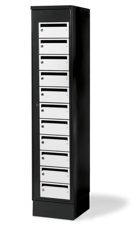 Postskåp och förvaringskåp, B 800 mm, 22 låsbara fack. Finns som öppen variant eller med låsbara fack. Utmärkt förvaringsskåp för laptops eller som postskåp där extra säkerhet kan vara viktigt. Luckor av kraftig konstruktion med cylinderlås samt brevöppning. Skåphöjd inklusive sockel 1900 mm, djup 400 mm. Stomme i svart (RAL 9005) färg, luckor i vit (RAL 9003) färg.