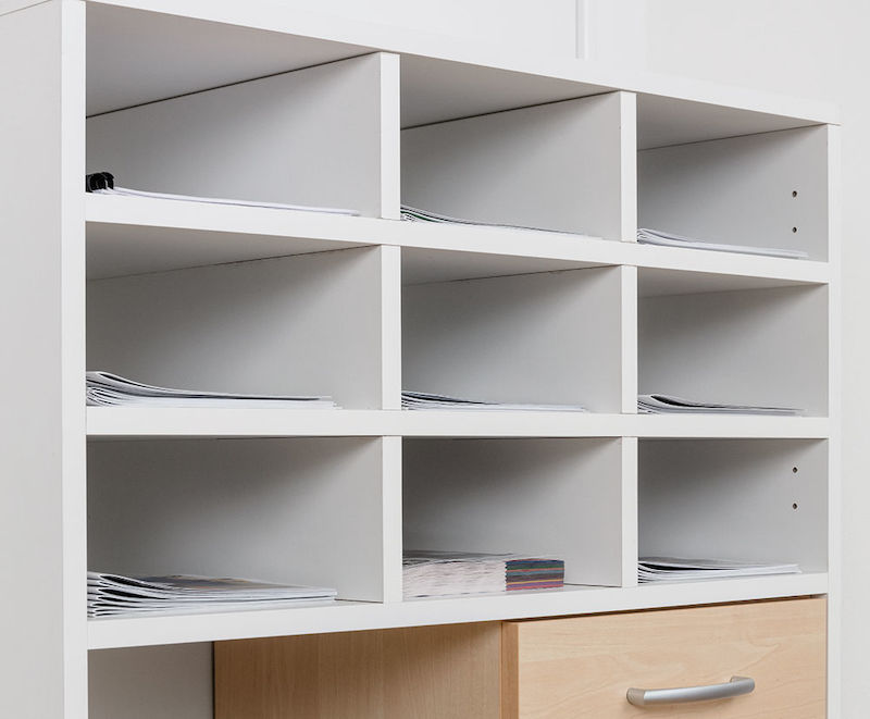 Postfack till Bokhylla Benna. En separat postfacksinsats möjliggör att bygga en effektiv postförvaring om så önskas.