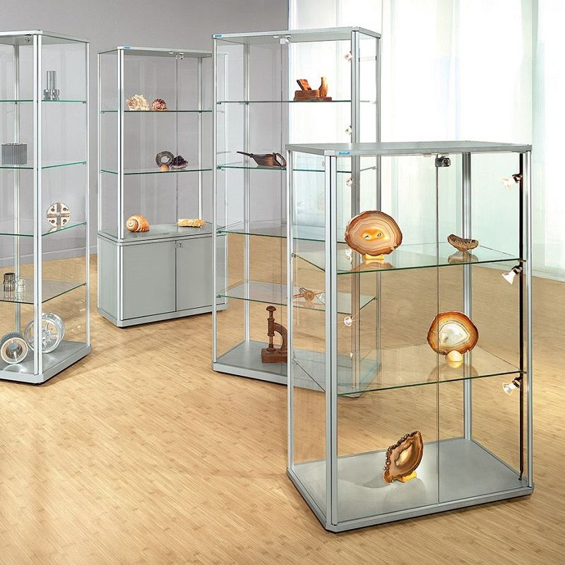 Glasskåp Ljusnan, för varje behov och användningsområde. De avfasade hörnen ger montrarna en exklusiv prägel. Silvereloxerade aluminiumprofiler i hög kvalitet. Väggar och dörrar av 4 mm tjockt härdat säkerhetsglas. Steglöst ställbara hyllplan av härdat säkerhetsglas. Dörrarna sitter på en vertikal aluminiumaxel i fullhöjd och kan därmed öppnas utan gångjärn. Säkerhetscylinderlås med 2 nycklar. Över- och underdel av MDF-skivor i aluminiumsilver färg (RAL 9006). Bottenskivan är urfräst på undersidan och har plats för de dolda monterade hjulen vid förflyttning, eller för en transformator för lågvoltsbelysning (finns som tillval). Välj med eller utan belysning där med belysning har ett skensystem med 20 W punktbelysning, steglöst ställbara i höjd. Glasskåp levereras omonterade. Aluminiumprofilerna är permanent fabriksmonterade på de härdade säkerhetsglasen. Denna glasmonter monteras enkelt och snabbt med ett nyutvecklat plugg- och fixsystem. När de inte används, eller om de ska flyttas till annan plats, kan de lätt tas isär igen och passar därför utmärkt för mässor och utställningar