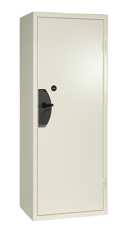Säkerhetsskåp Thio med nyckellås, 1900x750x500 mm. Säkerhetsskåp tillverkade i 4 mm stålplåt och förstärkta med borrskyddsplåt samt säkerhetsspärr som blockerar låset vid angrepp.