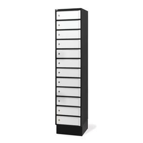 Laptopskåp Sono, BxDxH 400x550x1051, svart/vit, med eluttag, 1x6 fack. Säker förvaring av laptopar, mobiltelefoner med mera. Luckor av kraftig konstruktion med Assa cylinderlås 8450 i huvudnyckelsystem. Luckorna har speciellt utformad bakkantslåsning och låsanslag för en högre säkerhet. Går att få med eller utan inbyggda eluttag i skåpet.