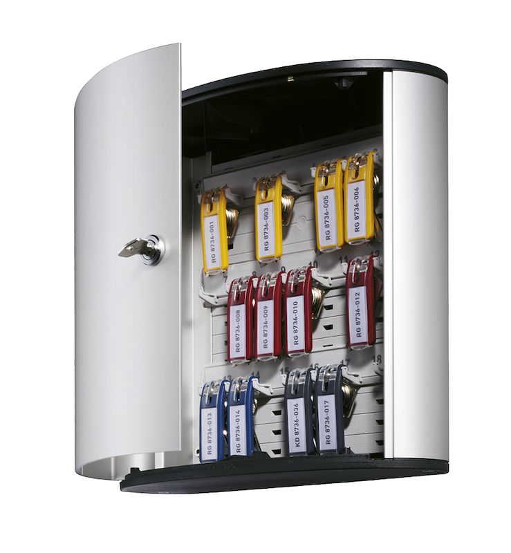 Nyckelskåp Key Box, aluminium, 18 krok, 280x300x120 mm. Smart funktion och snygg design! Nyckelskåpen passar i miljöer där många behöver ha tillgång till det låsta skåpet. Överskådlig innehållsförteckning som gör det lätt att hitta rätt nyckel.