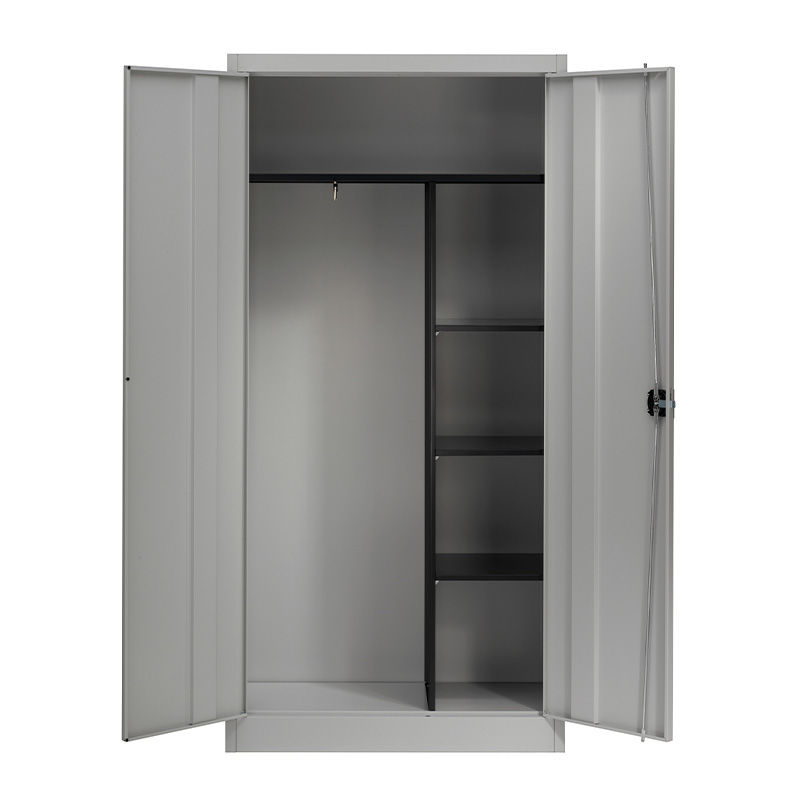 Plåtskåp Universal, inredning, 3 korta hyllplan och garderob, silver. Med dubbeldörrar. En sektion för förvaring av pärmar eller liknande och en sektion med garderobs inredning. Översta hyllplanet går att använda både som hatthylla och förvaring beroende på behov. Stabil, svetsad stomme av 0, 88 mm tjock, återvinningsbar stålplåt med högklassig brännlackering. Sockelhöjd 100 mm. Lackerade hyllplan, grafitsvarta (RAL 9011). Lastkapacitet per hyllplan ca 65 kg. Ställbara i höjd i steg om 35 mm. Vridstyva dörrar med boxförstärkning. öppningsvinkel 135°. Trepunkts låsning med säkerhetscylinderlås, individuellt låsande. Levereras med 2 nycklar som standard.