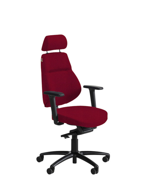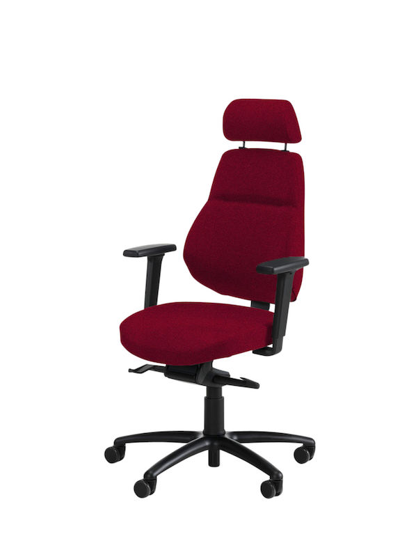 Som tillval kan stolen utrustas med ett uppblåsbart ländryggsstöd. Gasfjädern finns i olika höjder och stolen kan kläs i ett stort urval slitstarka tyg- och läderalternativ i många färger.