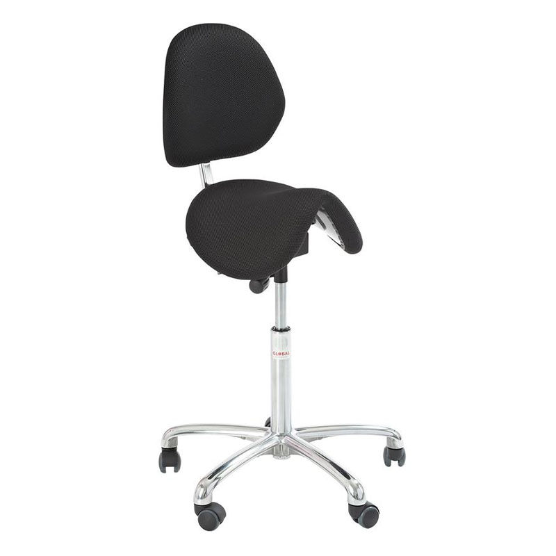 Sadelstol Dalton, svart tyg, med ryggstöd, freefloat. Sadelstol Dalton är formad som en "klassisk" cowboysadel, vadderad med skum och klädd i konstläder alternativt i tyg. Den ger god komfort och ergonomisk arbetsställning under arbetet. En avslappnad hållning och rak rygg gör att man kan sitta längre perioder och undviker på så sätt en dålig sittställning. Sadelstolen passar dig som vill träna upp ryggen.