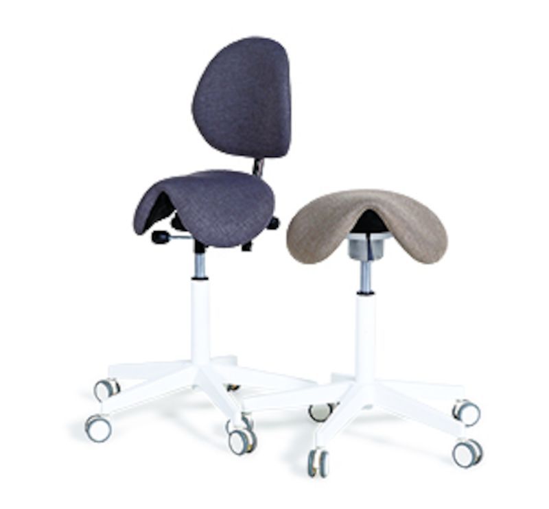 Sadelstol Skagen. Sadelstol Skagen kombinerar ergonomi med stil och design. Sadelstolen har en mjuk sits stoppad med formgjuten kallskum och ett tyg av högsta kvalité. Att sitta i ridande position med öppen vinkel i höften ger optimal ergonomisk sittställning som minskar risken för olika typer av belastningsskador. Stolen finns med vinklingsbar sits, flexmekanism eller freefloat sits.