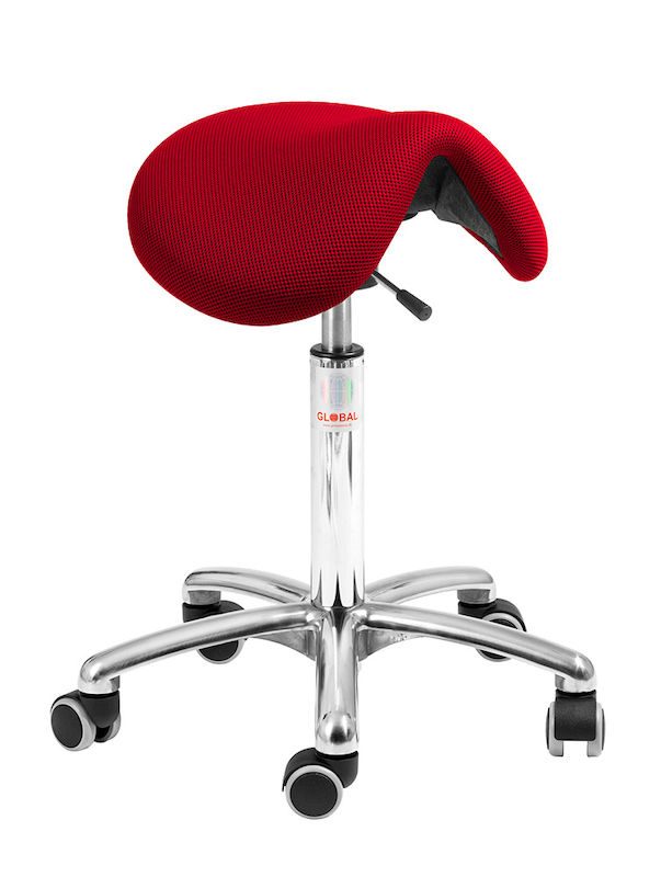 Sadelstol Dalton, röd tyg, utan ryggstöd, flexmekanism . Sadelstol Dalton är formad som en ”klassisk” cowboysadel, vadderad med skum och klädd i konstläder eller tyg. Den ger god komfort och en ergonomisk arbetsställning under arbetet. Den naturligt avslappnade hållning och raka rygg som sadelstolen främjar gör att man kan sitta längre perioder utan att belasta kroppen fel. Sadelstolen passar dig som vill stärka upp ryggen och förbättra din sittställning.