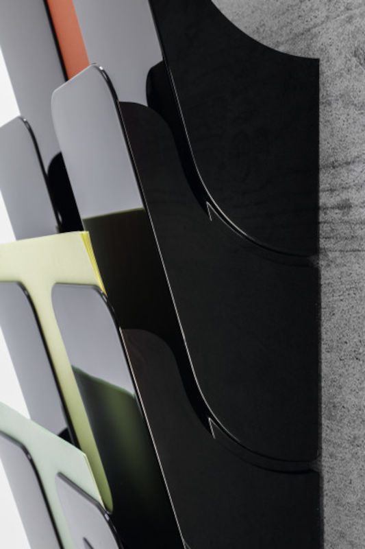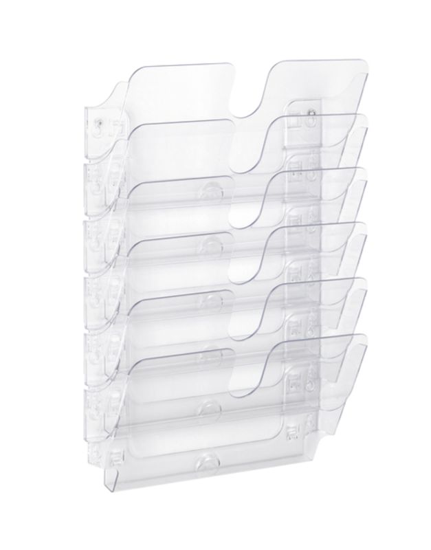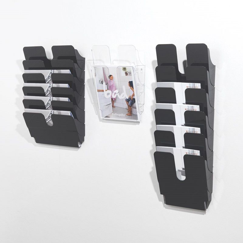 Monteras enskilt eller flera i rad. Skruv och plugg ingår för väggmontering. Varje fack rymmer 23 mm tjocka buntar. Finns i alternativen stående/liggande A4-format samt i svart eller transparent polystyrenplast. I 2 eller 6 facks utförande. Tillverkad i slagtålig polystyrenplast.