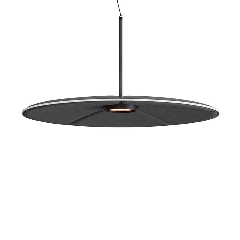 Takabsorbent Lily, med lampa, Ø 1200 mm, svart. Takabsorbent Lily har ett helt nytt formspråk, antingen som en lampa där den ljuddämpande funktionen är integrerad utan att störa varken objektets form eller upplevelsen av rummet eller som en traditionell nedhängande ljudabsorbent. Lily finns med eller utan dimmbar LED-belysning. Lily är 90 och 120 cm i diameter och är avsedd att belysa stora rum, till exempel restauranger och öppna kontorslandskap - miljöer där både buller och visuella intrycksnivåer är höga. Lily består av en tygklädd kärna av vit polyester och finns i 6 olika färger i tyg Blazer. 230V, 900-1100 Lumen, 2700 Kelvin, spridningsvinkel 110 grader. Takfäste ingår. Vajerns längd är 3 m. Elkabeln är 6 m.