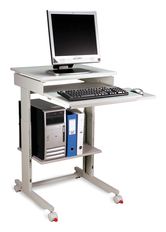Lyft skärm och tangentbordsskiva och hitta den rätta arbetshöjden helt utan rattar, låses fast med ett klicksystem. Datautrustningen behöver ej tas bort från bordet vid höjning eller sänkning. Utrustad med 4 hjul för enkel förflyttning.