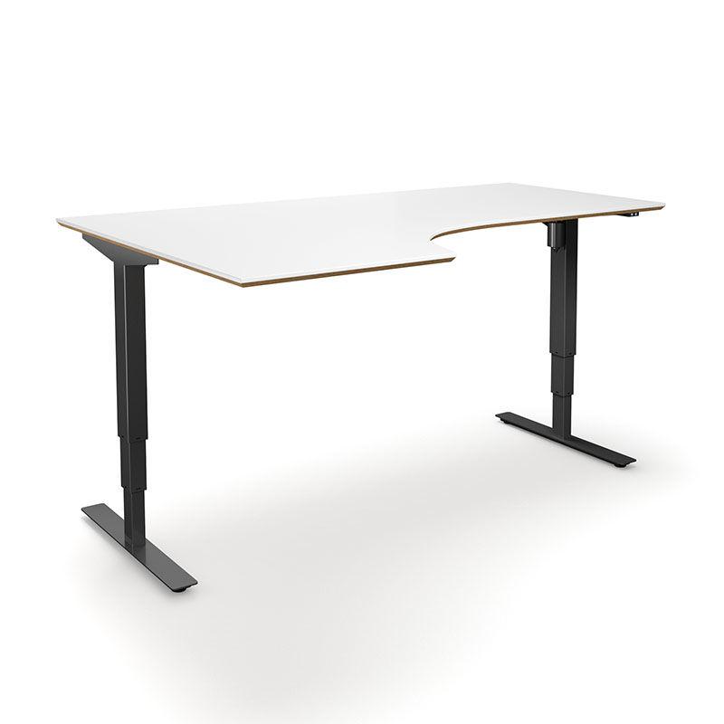 Höj och sänkbart hörnskrivbord Atlanta Trend, vänster, LxB 1800x1200 mm, vit/svart, ett elektriskt höj och sänkbart skrivbord. Bordskivan kommer med fasade kanter vilket ger en stilren känsla av ett tunt och modernt höj och sänkbart skrivbord som är tilltalande för ögat. De rundade hörnen är gjorda för att passa in i en modern kontorsmiljö med fristående placering av skrivbord. Bordskivan är tillverkad i 25 mm tjock MDF belagd med vit laminat samt en 10 mm vit kantlist av ABS-plast. Det höj och sänkbara stativet finns lackerat i vitt, svart eller silver. Höj och sänkbart H 630-1280 mm (slaglängd 650 mm) hastighet 25 mm/s, Maxbelastning 150 kg vid utbredd belastning.