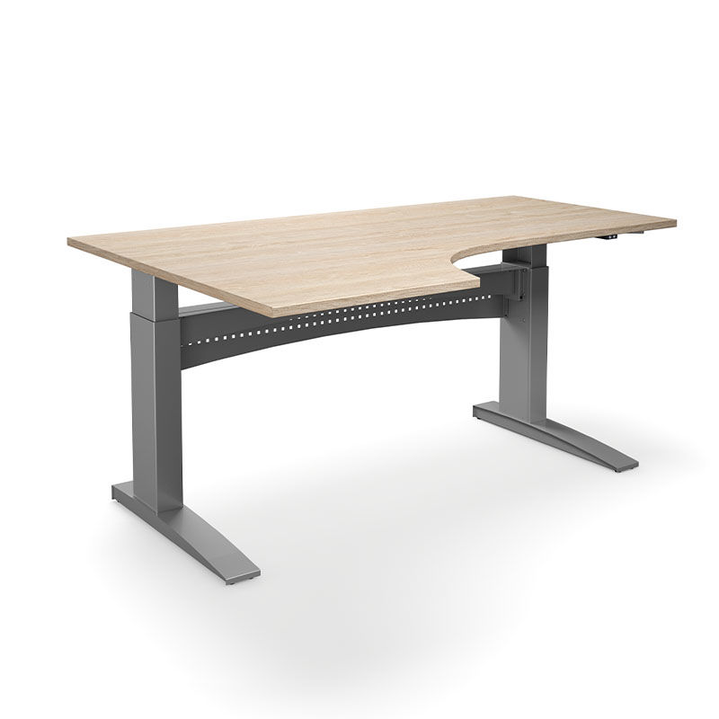 Höj och sänkbart hörnskrivbord Denver, vänster, LxB 1800x1200 mm, ek/silver . Elektriskt höj och sänkbart skrivbord, H 630-1200 mm, hastighet 30 mm/s synkronlift. Maxbelastning 150 kg (utbredd belastning). Stativ i svart strukturlack (RAL 9004) eller silver strukturlack (RAL 9006). Bredd på stativet är 1560 mm. Skivan finns går att få i både laminat och fanér. Laminat: Skiva belagd med en bok, björk, ek eller vitfärgad laminat med kantlist av ABS-plast. Bordsytan är hård och mycket tålig mot repor och slag. Färgen är konstant, den ändrar sig med andra ord ej utseendemässigt när den åldras. Fanér: Skiva belagd med ett tunt skikt av riktigt trä i bok eller björk med kantlist av massivträ. Ytan har en naturlig träkänsla och är mjukare än laminat. Precis som i naturen åldras trä och får med tiden en vacker patina som bara ett naturligt material kan få.