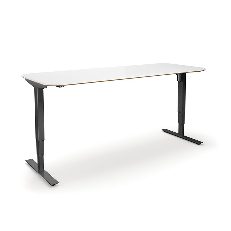 Höj och sänkbart skrivbord Atlanta Trend, rak, runda hörn, LxB 2000x800 mm, vit/svart, ett elektriskt höj och sänkbart skrivbord. Bordskivan kommer med fasade kanter vilket ger en stilren känsla av ett tunt och modernt höj och sänkbart skrivbord som är tilltalande för ögat. De rundade hörnen är gjorda för att passa in i en modern kontorsmiljö med fristående placering av skrivbord. Bordskivan är tillverkad i 25 mm tjock MDF belagd med vit laminat samt en 10 mm vit kantlist av ABS-plast. Det höj och sänkbara stativet finns lackerat i vitt, svart eller silver. Höj och sänkbart H 630-1280 mm (slaglängd 650 mm) hastighet 25 mm/s, Maxbelastning 150 kg vid utbredd belastning.