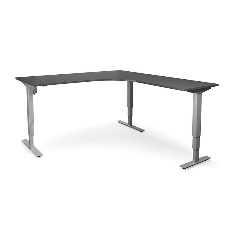 Höj och sänkbart hörnskrivbord Atlanta, höger, LxB 1800x2000 mm, mörkgrå/silver. Höj och sänkbart elstativ, H 630 - 1280 (slaglängd 650 mm) hastighet 25 mm/s, stativ lackerat i vitt, silver eller svart.
