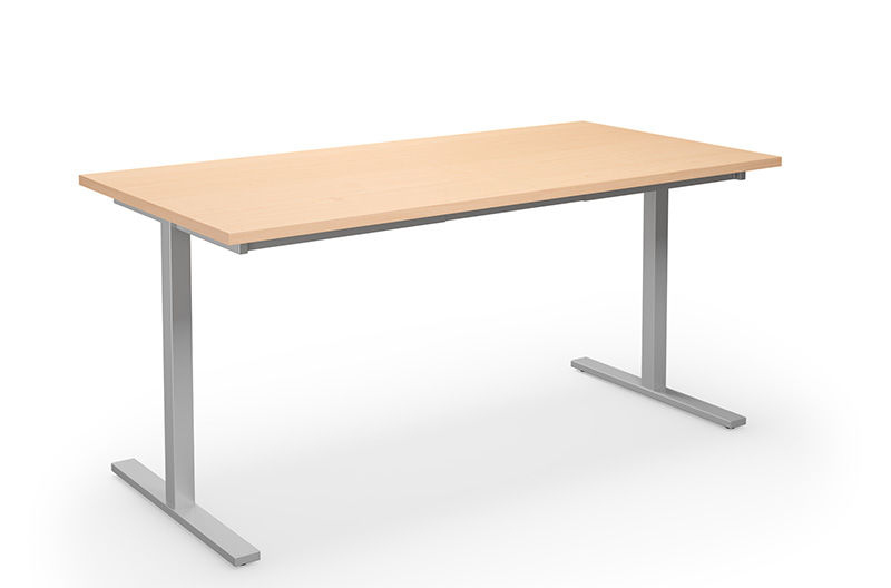 Bord DUO-T, rak skiva, LxB 1600x800 mm, björk/silver. Modernt skrivbord för kontor med stadigt T-stativ och laminatskiva som är lätt att rengöra.