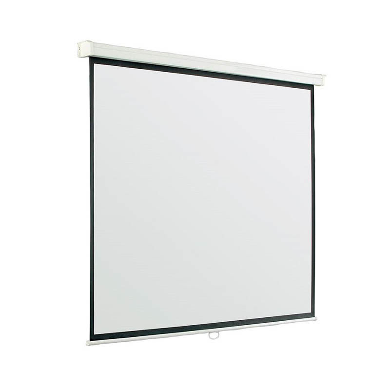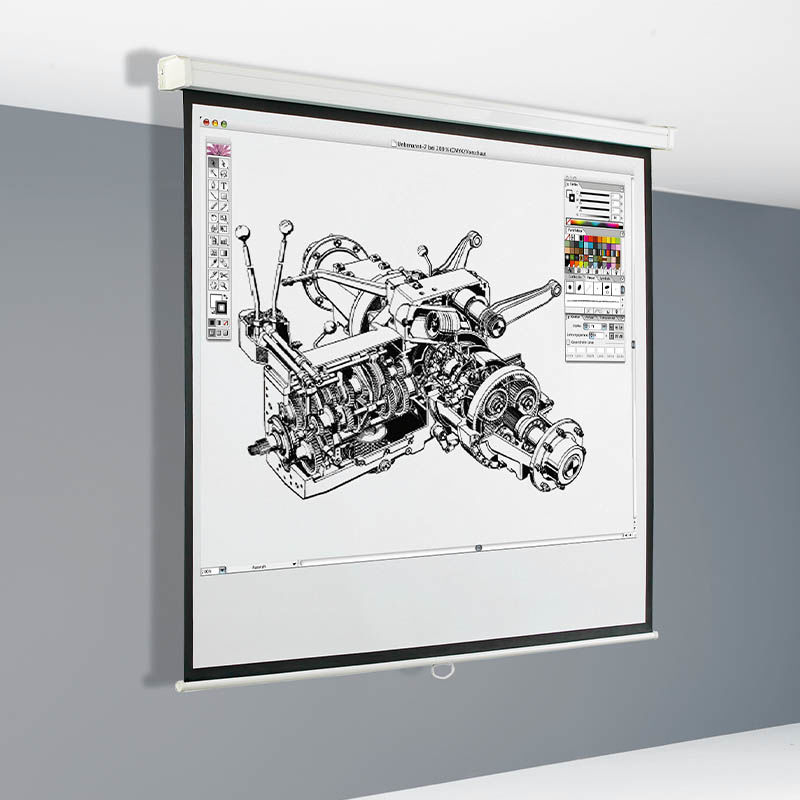 Videoformat 4:3 för datorprojektion. Bildyta av hållfast polyesterväv. Mattvit yta, diffust reflekterande. Ljustäthetsfaktor ca 1,1. Fjäderanordning för snabb och enkel in- och utrullning och för optimal spänning. Vitt aluminiumhus. Svart ram, 30 mm bred runtom.