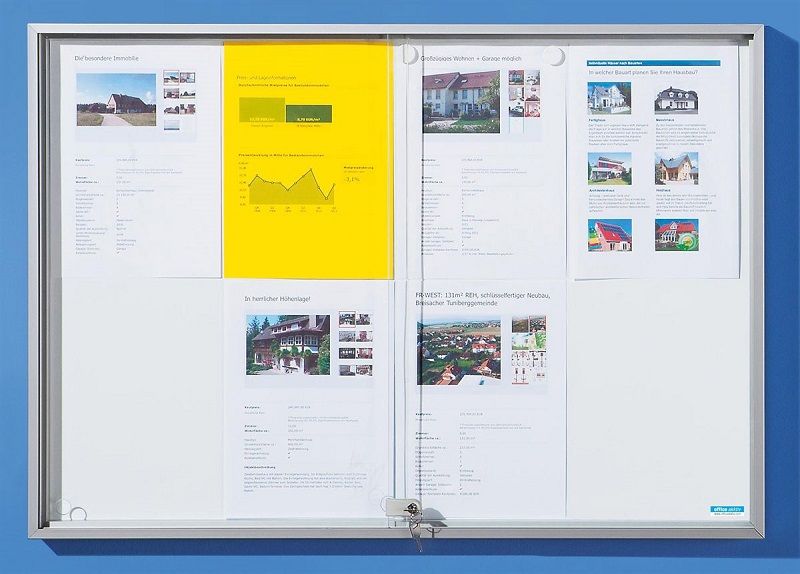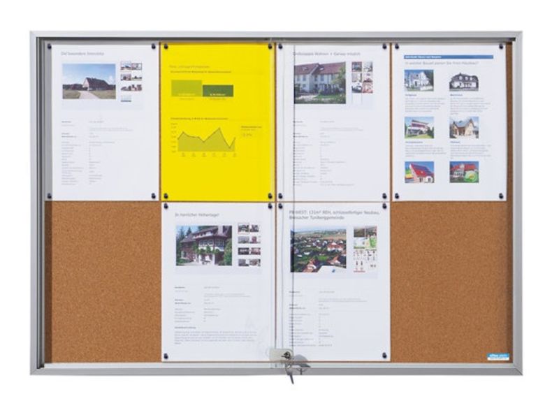 Skyltskåp med Skjutdörrar, inomhus, BxHxD 2006x947x50 mm, kork. Idealisk för trånga utrymmen med sina utrymmessparande skjutdörrar. Ram av silvereloxerad aluminium. 4 mm härdat säkerhetsglas. Säkerhetscylinderlås inklusive 2 nycklar. Byggmaterialklass B1 (svårantändlig) DIN 4102, vilket gör den idealisk för inredning av skolor, offentliga byggnader och myndigheter. Utvändigt djup 50 mm, fritt inre djup 24 mm. Finns i flera olika storlekar.