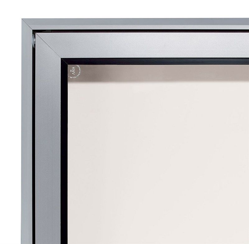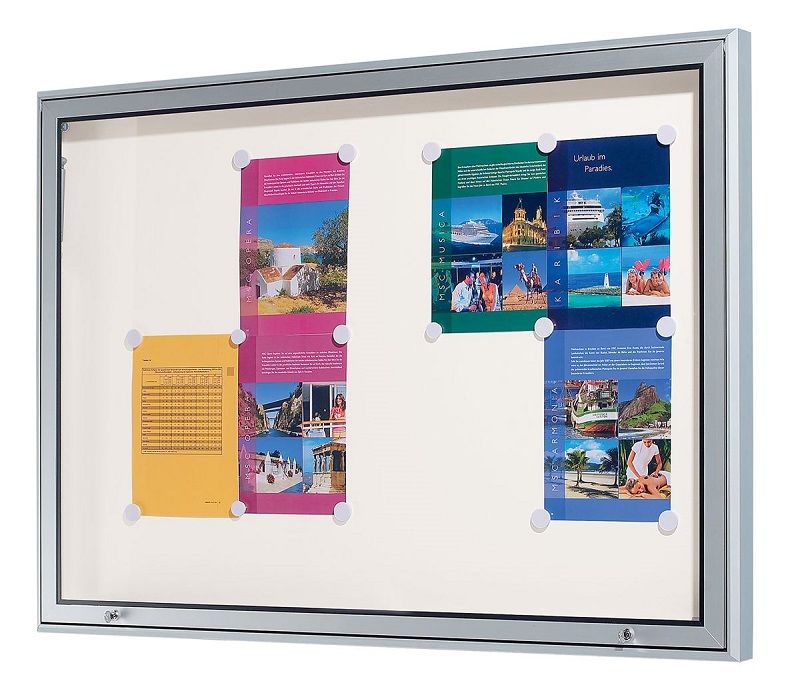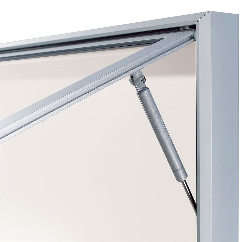 Skyltskåp med gasfjäder, 21 A4, ram rundad. Alternativt för inom- eller utomhusbruk. Utvändigt djup 50 mm, fritt inre djup 20 mm. Galvaniserad, magnetisk metallbakvägg, pulverlackerad i vit färg (RAL 9010). Stabil, vridstyv ram av silvereloxerad kraftig aluminium. Infälld aluminiumdörr med dolda beslag av pressgods och robust, 4 mm tjockt härdat glas. Mycket repfast och stabil glasyta, helt okänslig för rengöringsmedel. Säkerhetscylinderlås framtill, 2 nycklar ingår som standard. Finns i flera olika storlekar.