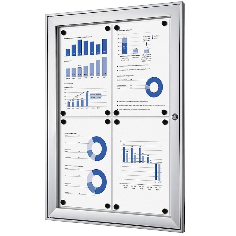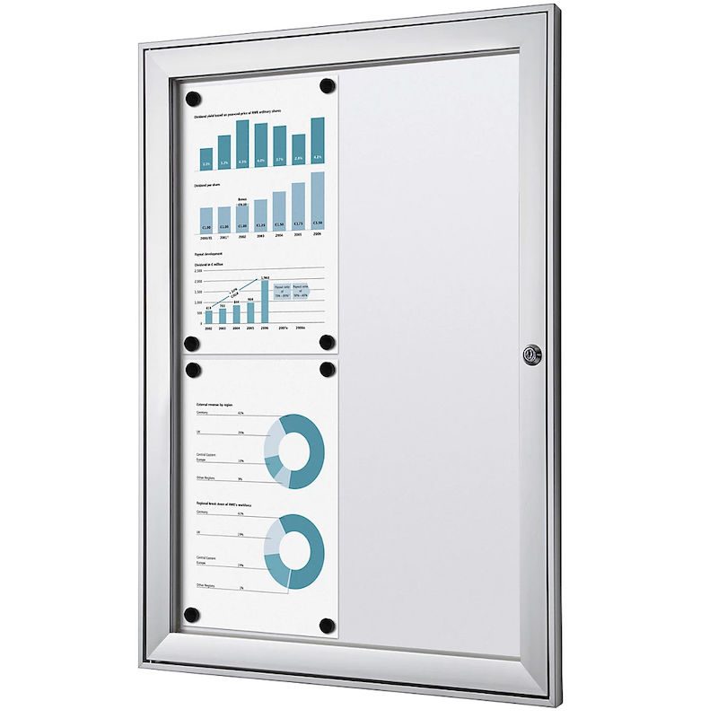 Skyltskåp för inomhusbruk, BxHxD 522x697x33 mm, metall. Elegant och tidlös, ram och dörr av silvereloxerat aluminium med 3 mm akrylglas. Säkerhetscylinderlås med 2 nycklar. Utvändigt djup 33 mm, fritt inre djup 22 mm. Finns i flera olika storlekar.