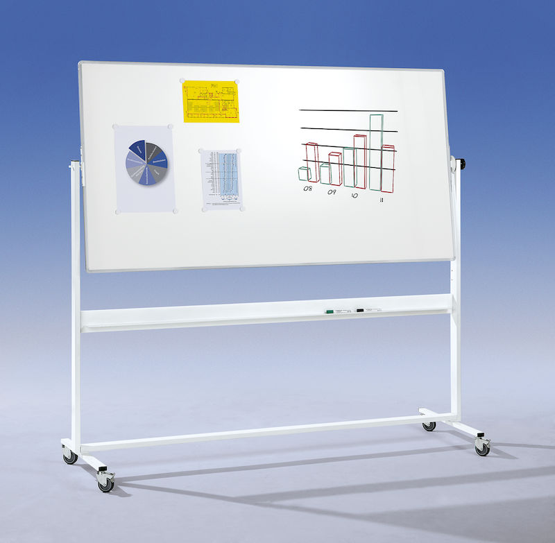 Whiteboard på hjul Vibeke, BxH 1200x900 mm, lackerad. Dubbelsidig whiteboard med magnetisk skrivyta, silvereloxerade aluminiumram med rundade hörn i plast. Tavlan är vridbar horisontellt och kan låsas fast i önskat läge. Stabilt vitlackerat stativ med praktisk pennhylla och 4 länkhjul varav 2 låsbara.
