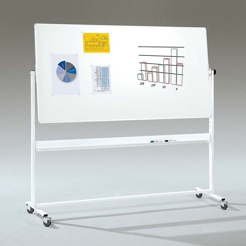 Whiteboard på hjul Vibeke. Dubbelsidig whiteboard med magnetisk skrivyta, silvereloxerade aluminiumram med rundade hörn i plast. Tavlan är vridbar horisontellt och kan låsas fast i önskat läge. Stabilt vitlackerat stativ med praktisk pennhylla och 4 länkhjul varav 2 låsbara.