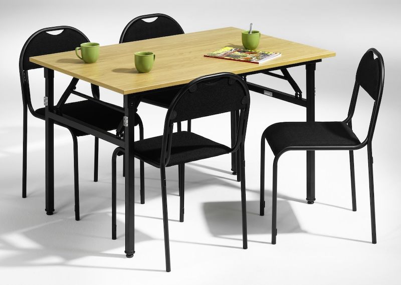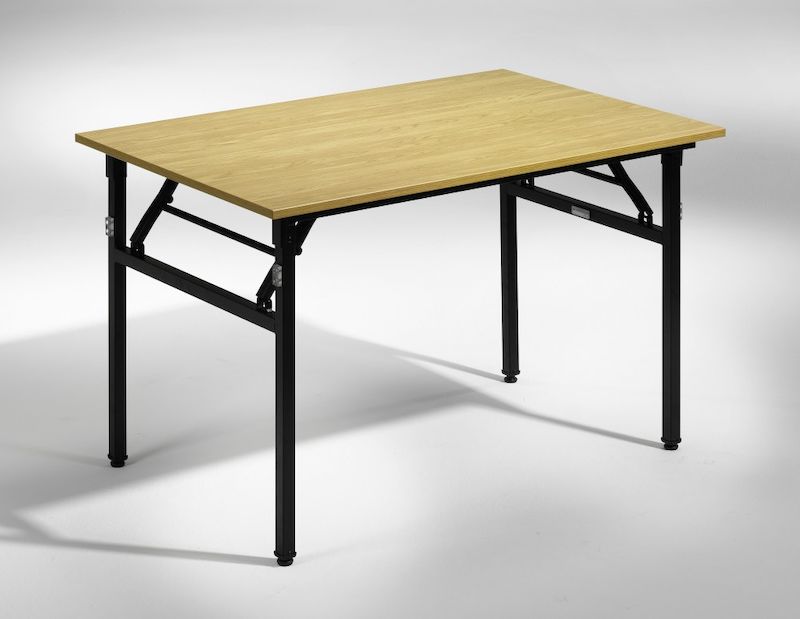 Fällbord Starko, 1200x700 mm, ek/svart. Fällbord med laminatskiva och kraftigt stativ med ställfötter. Svartlackerat bordsunderrede i 30x30 mm stålrör, fälls upp eller ihop med ett enkelt handgrepp. Staplingsdistanser ger bra skydd av bordsskivan samt säker och stabil stapling.