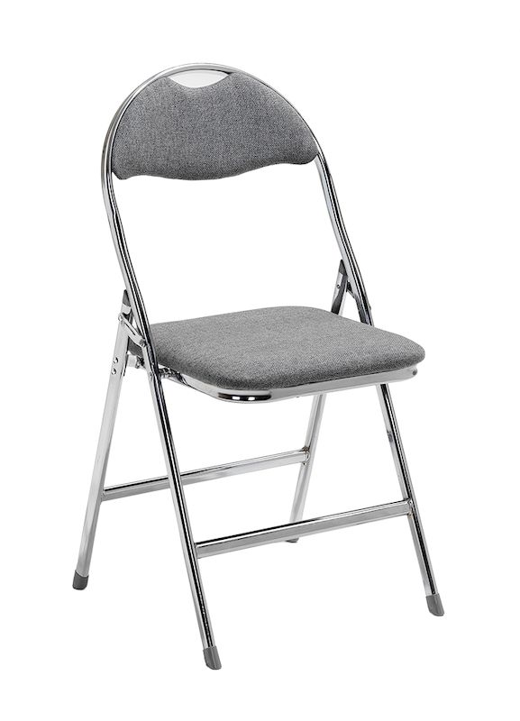 Fällbar stol med kromat stativ och tre olika färger på tyget. Bekväm sits med storlek 390x390 mm. Sitthöjd 450 mm.