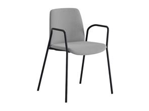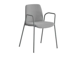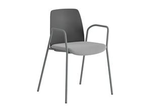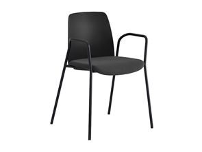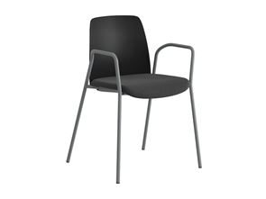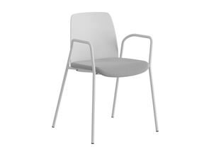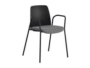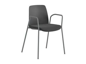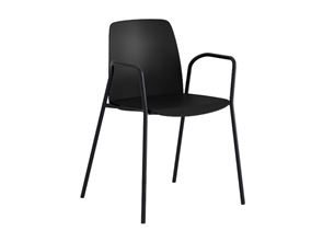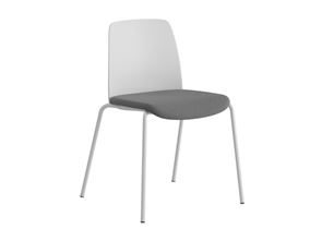Med sits och rygg i plast samt ett stabilt fyrbensunderrede.