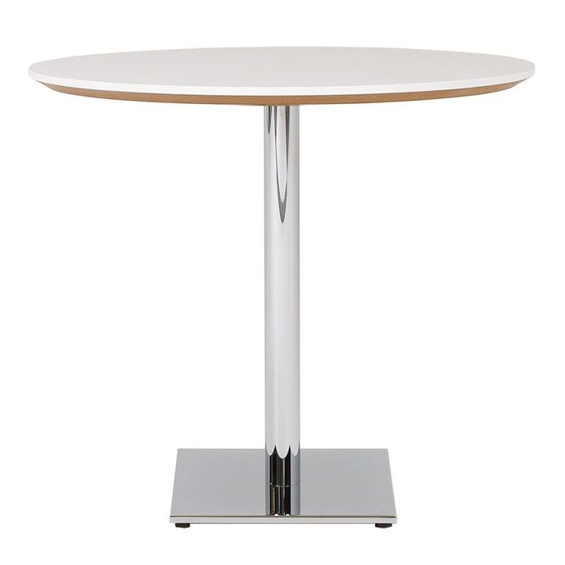 Pelarbord Trend, Ø 900 mm, kromad fyrkantsfot. Ett modernt bord med skiva i vit laminerad MDF. Skivan har vit kantlist med 30 graders fasad kant för ett smäckert utseende. Stativ finns i krom, svart och vit lackering och med rund alternativt fyrkantsfot. Höjd 755 mm. Skivan finns i flera olika storlekar.