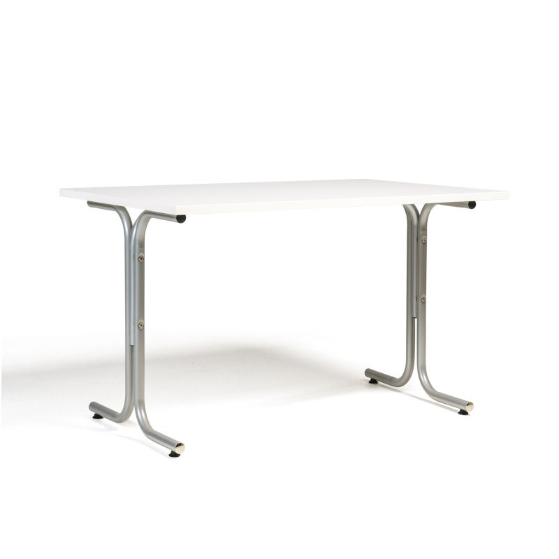 Matsalsbord Vicky Square, LxB 1200x800 mm, vit/silver. Funktionella rektangulära cafebord och matbord som finns i storlekar från 1200 mm till 1800 mm i längd. Bredd 800 mm. Kommer med justerbara fötter så bordet kan stå stabilt även på ojämnt underlag. Skivan finns i björk, bok eller vit laminat. Laminat är en stryktålig yta som tål mycket användande. Stativ kommer i kromat, svartlackerat eller silverlackerat utförande.
