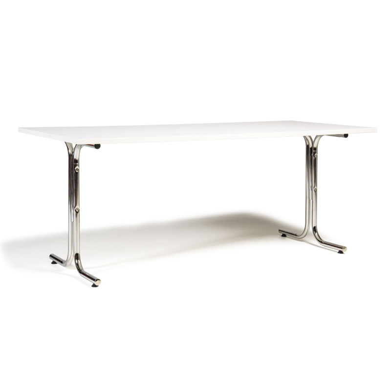 Matsalsbord Vicky Square, LxB 1800x800 mm, vit/krom. Funktionella rektangulära cafebord och matbord som finns i storlekar från 1200 mm till 1800 mm i längd. Bredd 800 mm. Kommer med justerbara fötter så bordet kan stå stabilt även på ojämnt underlag. Skivan finns i björk, bok eller vit laminat. Laminat är en stryktålig yta som tål mycket användande. Stativ kommer i kromat, svartlackerat eller silverlackerat utförande.