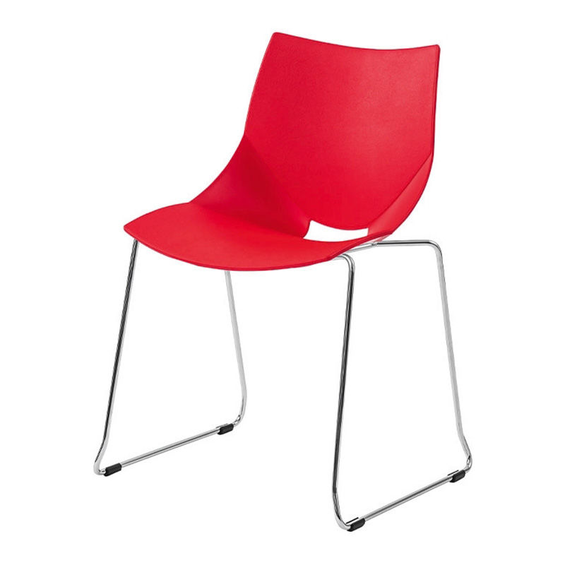 Lunchstol Jonas, medstativ, krom/röd. Modern och bekväm lunchstol i åtta färger. Helgjuten plaststol med eleganta linjer och formspråk. Stolen Jonas finns med två olika kromade underreden, benstativ eller medar.