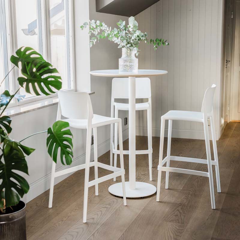 Barbord Trend. Modernt barbord med skiva i vit laminerad MDF. Skivan har vit kantlist med 30 graders fasad kant för ett smäckert och modernt utseende. Stativ finns i krom, svart och vitt utförande och med rund alternativt fyrkantsfot. Höjd 1125 mm. Finns i olika storlekar på skivan och med flera olika typer av underreden.