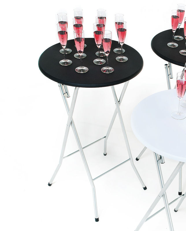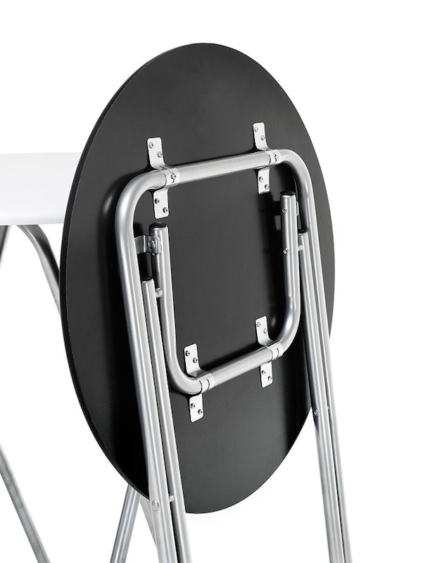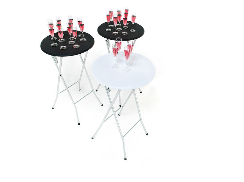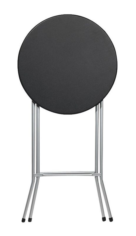 Fällbart ståbord, svart skiva. Ett fällbart ståbord i stabil konstruktion som är enkelt att hantera. Tålig bordsskiva med stomme av MDF samt ett skyddande hölje av plast (PVC). Silverlackerade bordsben av metall. Ståborden är hopfällbara och tar minimalt med utrymme när de inte används.