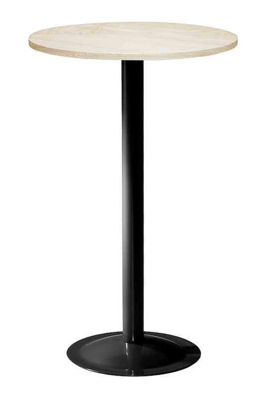 Ståbord Sputnik, ek/svart. Ett ståbord som kommer med ett svart eller silverlackerat stålstativ med bordsskiva i laminat. Skivan finns i bok, björk, ek eller vit laminat. Höjd 1100 mm, diameter 700 mm.