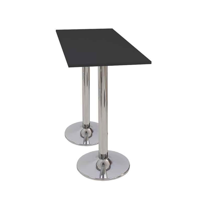 Ståbord Texas 1400x600 mm, svart/krom. Ståbord med en rund pelarfot i krom. Kommer med justerbara tassar under fotplattan så man kan ställa den även på ojämnt underlag. Skiva i bok, björk, vit eller svart laminat. Pelare Ø 87 mm och fotplatta 500 mm. Finns med en eller två pelare.