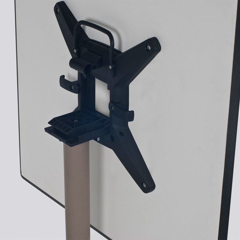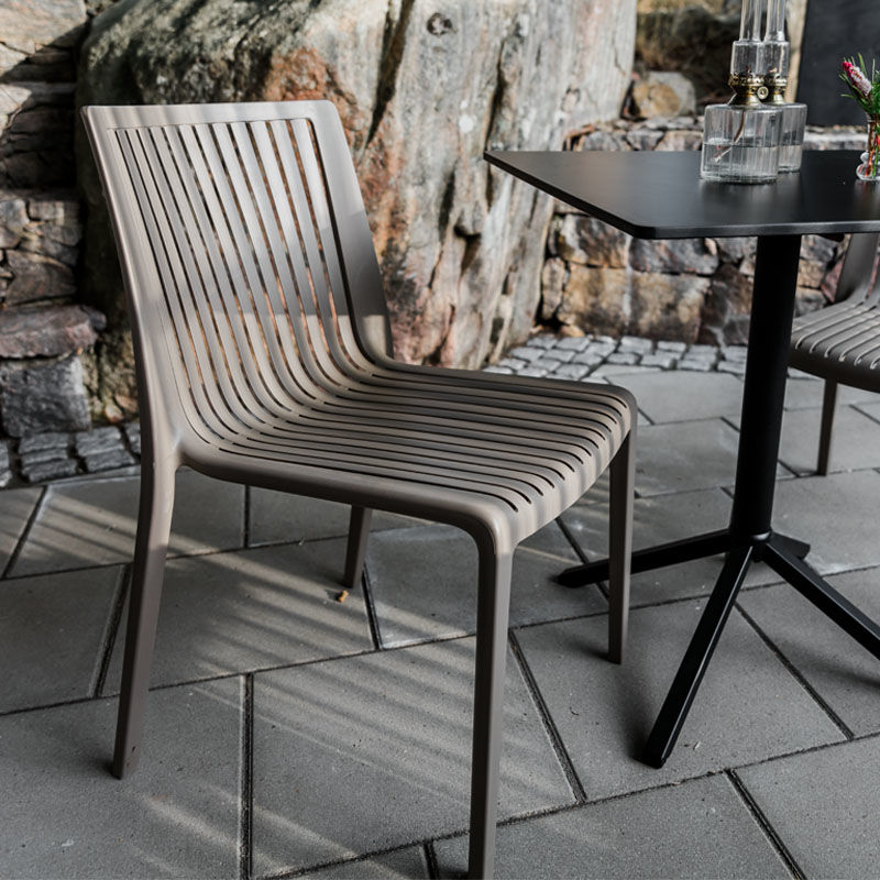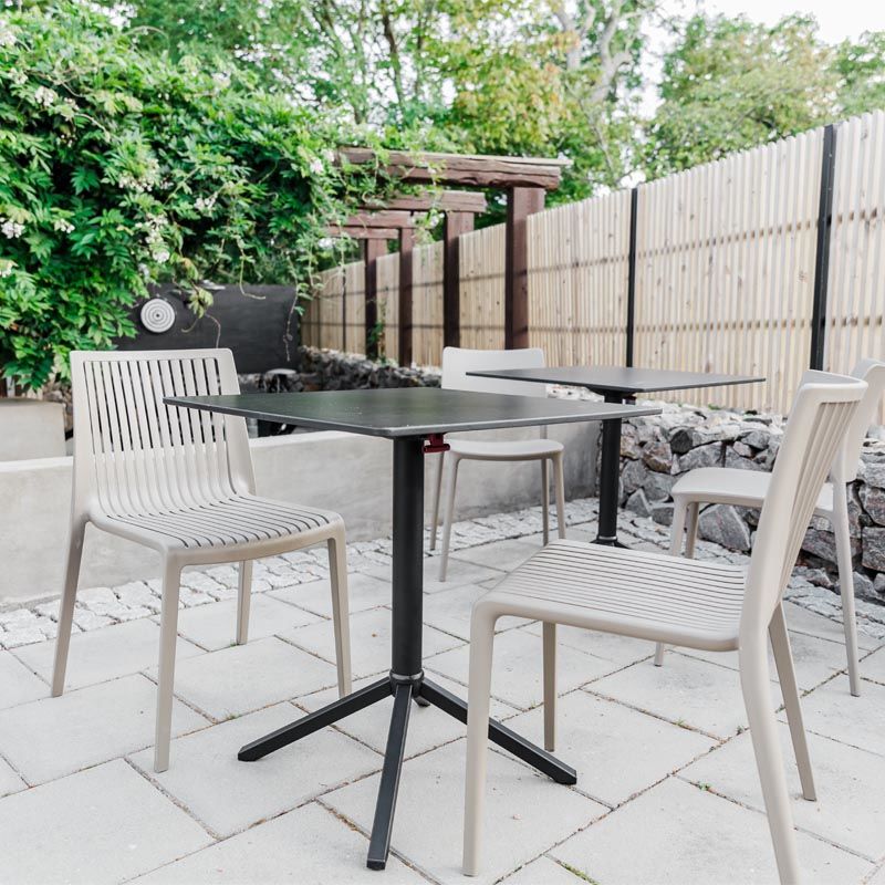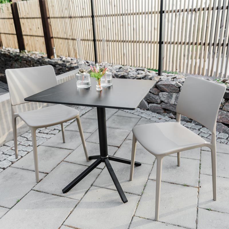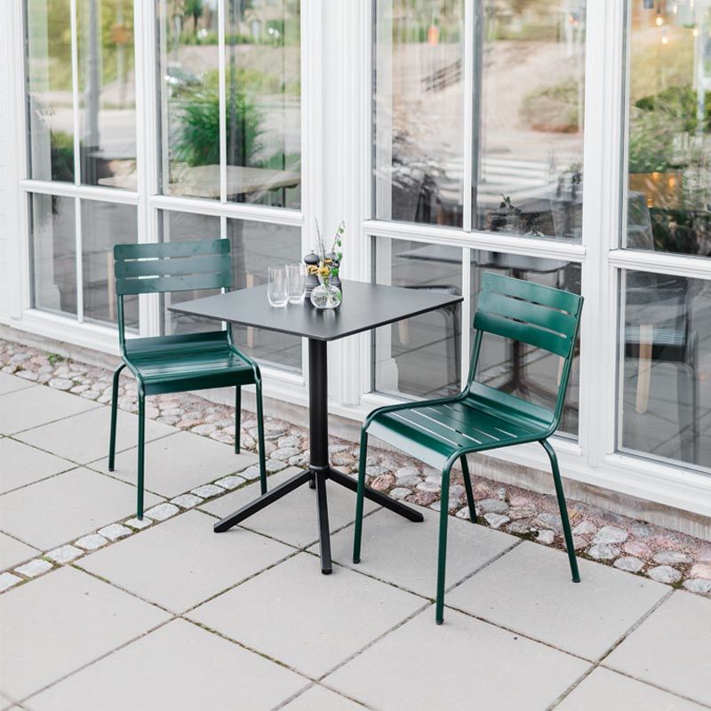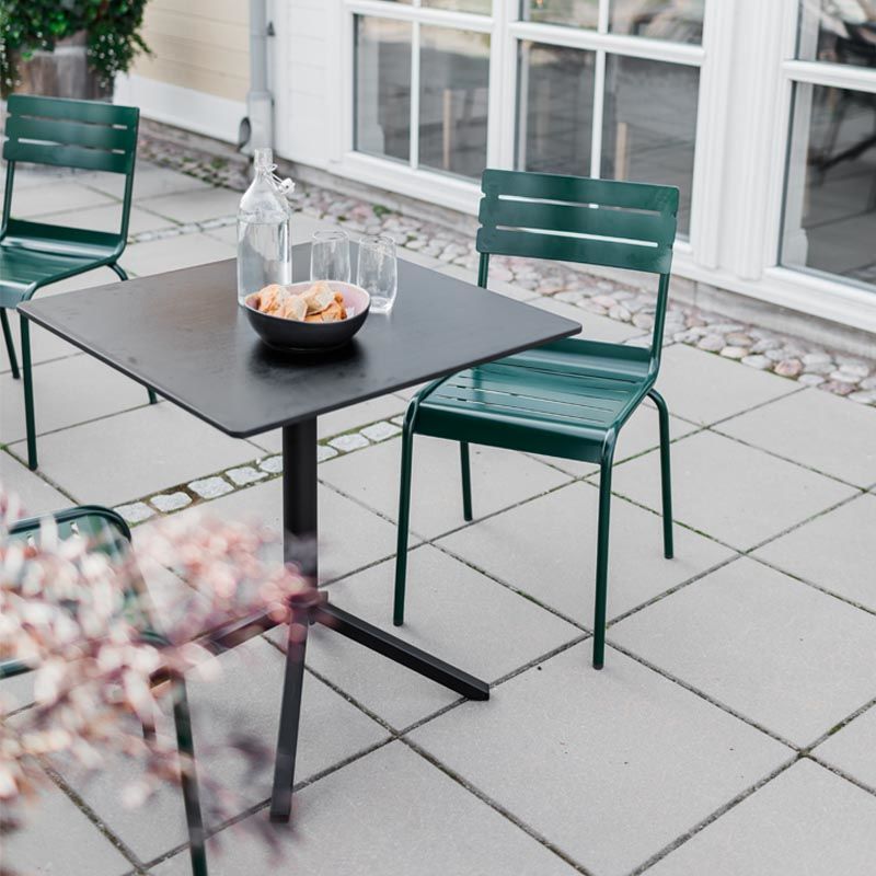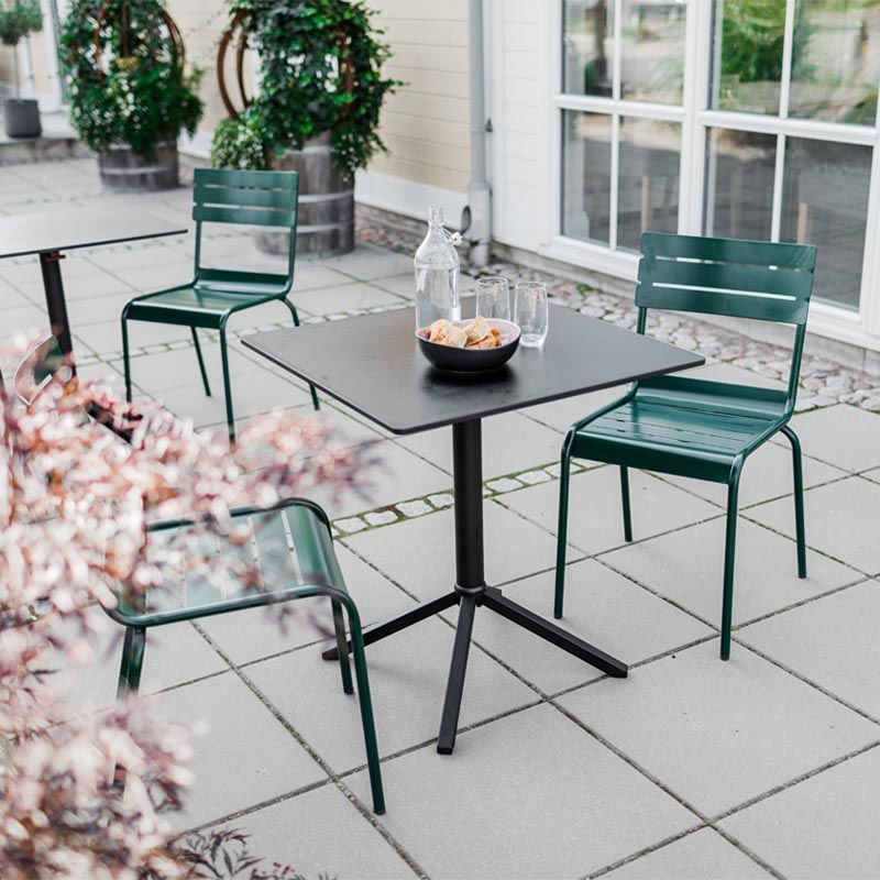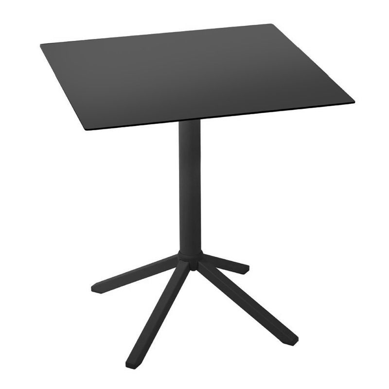 Cafébord Julie, hopfällbart, fyrkantig, svart. Cafébord Julie är ett hopfällbart bord med svart metallstativ och bordsskiva i högtryckslaminat. Med ett enkelt handgrepp viker du skivan horisontellt och kan då stapla flera bord tätt ihop stående, vilket är utmärkt för yteffektiv förvaring. Cafébordet finns med rund eller fyrkantig bordsskiva.