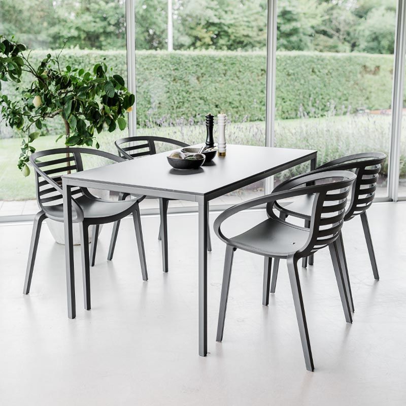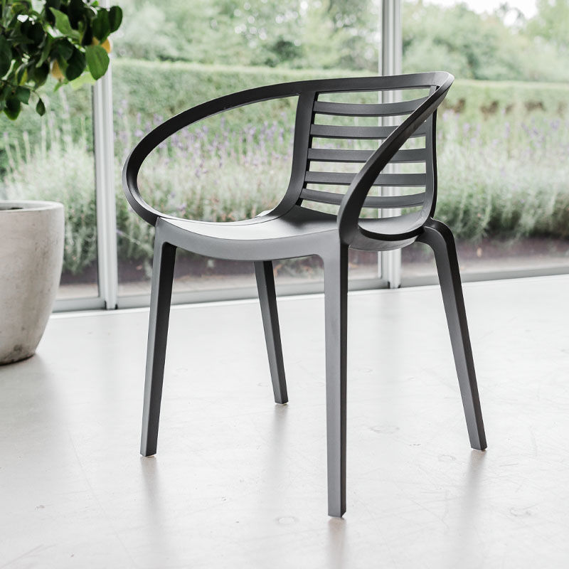 Caféstol Boel, antracit, 4 st/fp. Caféstol Boel är en stapelbar monobloc-stol gjord i en enda detalj. Den tillverkas med formsprutning i en glasfiberförstärkt polypropen som är UV-stabiliserad. Tack vare materialet som används är den ett perfekt val för utomhusbruk, men den funkar även utmärkt inomhus. Boel har en ergonomisk form och erbjuder stor komfort med tillhörande dyna som tillval.