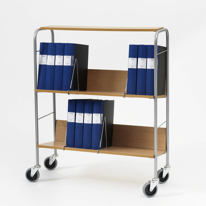En praktisk bokvagn som rymmer 28 pärmar. Fyra ställbara pärmstöd ingår. Silverlackerrat stativ. Hyllor i boklaminat (820x290 mm). Topphylla som fungerar utmärkt som arbetsyta eller avlastning. Vagnarna är utrustade med fyra länkhjul. Total höjd med topphylla är 1060 mm.