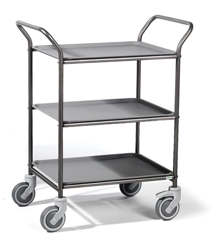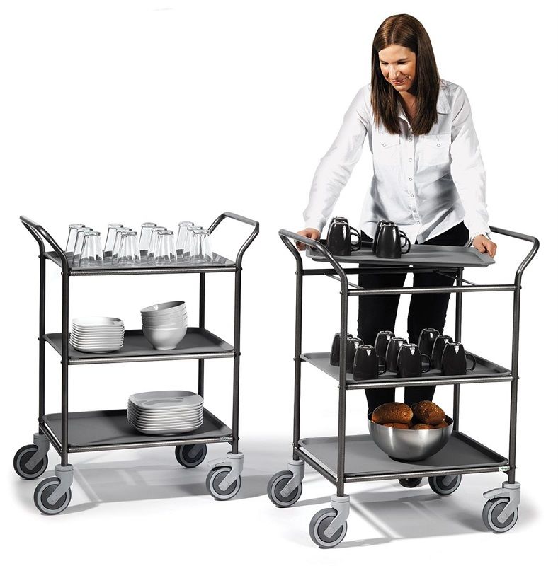 Brickvagn Servering, bricka 600x450 mm, grå bricka, grått stativ. En praktisk serveringsvagn med löstagbara brickor. En praktisk brickvagn för servering, med 3 lösa brickor i plast som enkelt kan lyftas i och ur vagnen. Brickorna är 600x450 mm stora och har en non-slip-yta som förhindrar att det som står på brickan glider runt.