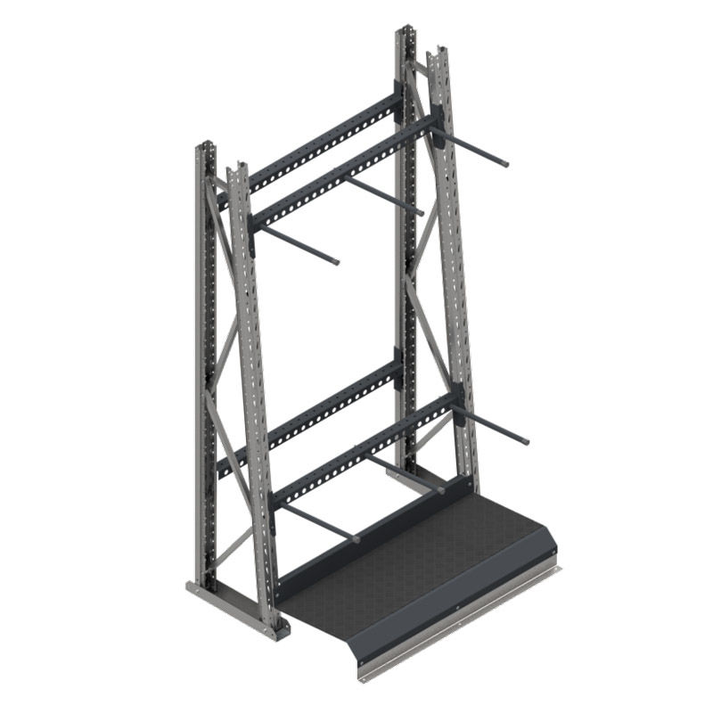 Listställ Derek enkelsidig, grundsektion, stål, 2500x1388x625 mm. Enkelsidigt listställ med golvpodie för stående lagring av lister och rör. Galvade gavlar och avdelare med balkar i orange pulverlack.