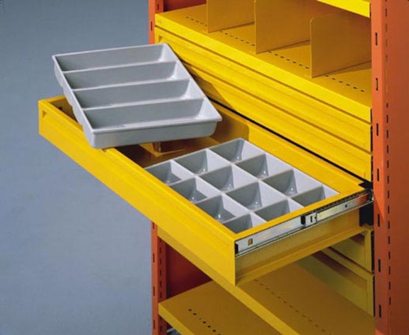 Lådinsats för stållådor till Gerdmanshyllan, för 500 mm djup, 8 fack. Används för att få ordning på innehållet i dina lådor.