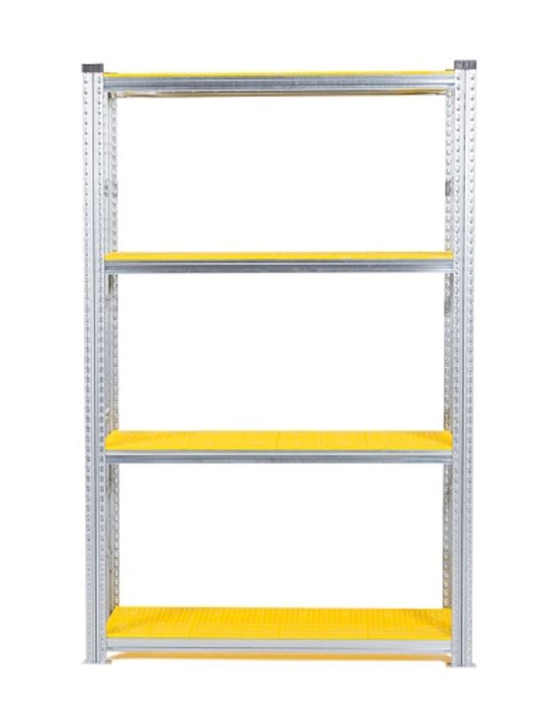 Lagerhylla Flex, grund, BxDxH 1276x400x1972, 4 st gula hyllplan. Ett flexibelt hyllsystem av galvaniserat stål med många användningsområden. Låg egenvikt med klarar hög belastning, 135-350 kg/hyllplan. Flyttbara balkar, 33 mm:s intervall. Olika typer av hyllplan för olika arbetsmiljöer. Enkel att montera (inga bultar eller skruvar). Kan användas från båda håll, inga krysstag behövs. Gavlar levereras monterade, bärbalkar och metallfötter ingår i varje sektion. Samtliga plasthyllplan är perforerade för att fungera i miljöer med sprinklersystem då vattnet rinner igenom hyllplanen. Alla plasthyllplan är även godkända för livsmedelsmiljö.